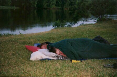 We had barbequed chicken for supper. Mark and I played soccer with some younger kids near us. We also had a campfire that I built. I had some s'mores. Mark and I slept outside. We fought until about 11:00 when we went to sleep.